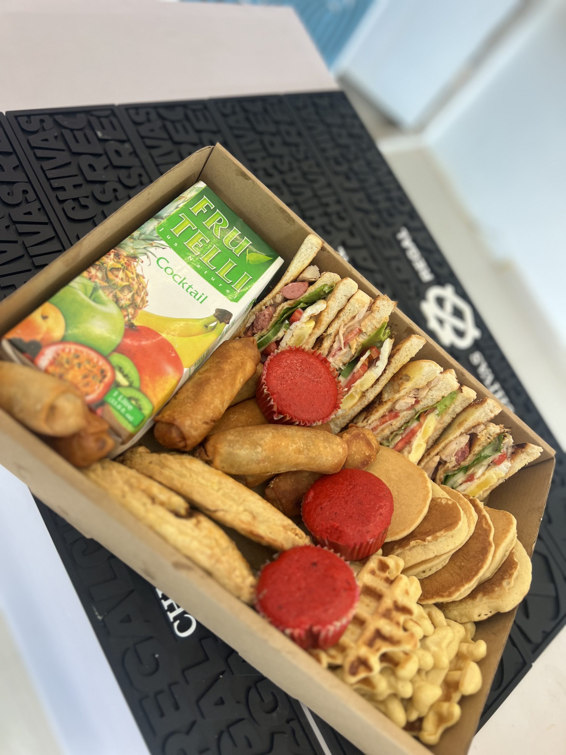 This pastry pack can serve 2/3 heads. It contains; sandwich, juice, spring rolls and samosa, pie, pancake, waffle and cupcakes
